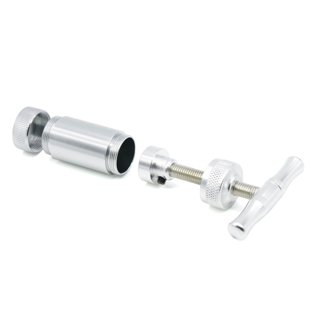 This Pollen Press is absolutely top of the line! Made from Aircraft Grade Billet Aluminum. Manufactured on High Tech CNC Equipment to ensure precision fit and absolutely smooth operation. T-Shaped handle provides outstanding grip when making pollen cakes.