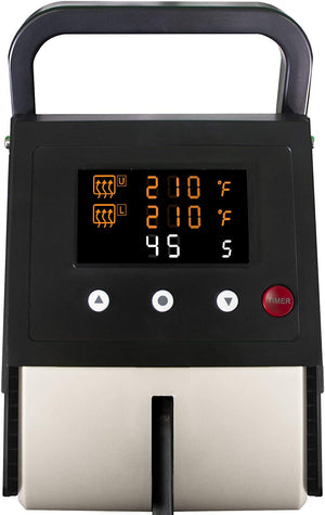 DIGITAL CONTROL PANEL: Separate temperature control (less than +/- 1 F) for both upper and lower plates. Timer and Fahrenheit/Celsius functions are included.