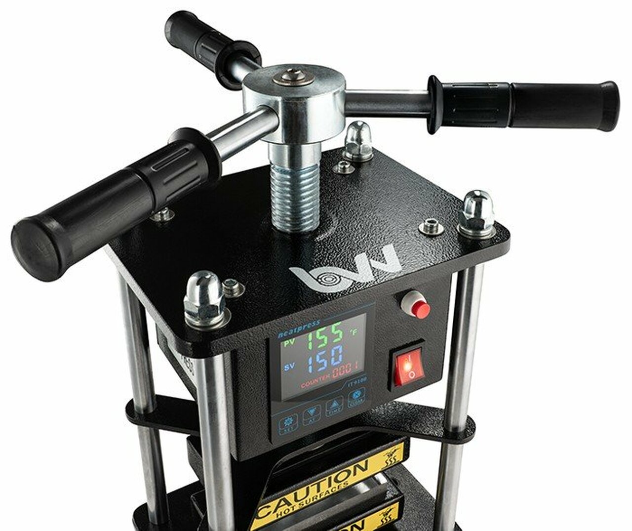 This is the BVV Rosin Twist Press with touch screen controller and dual heated aluminum billet plates with a temperature range of RT to 482°F. This press is easily programmable and has a countdown timer when the plates are engaged for consistent pressing of material with a pressure rating up to 2500lbs and can be securely bolted to a table top.