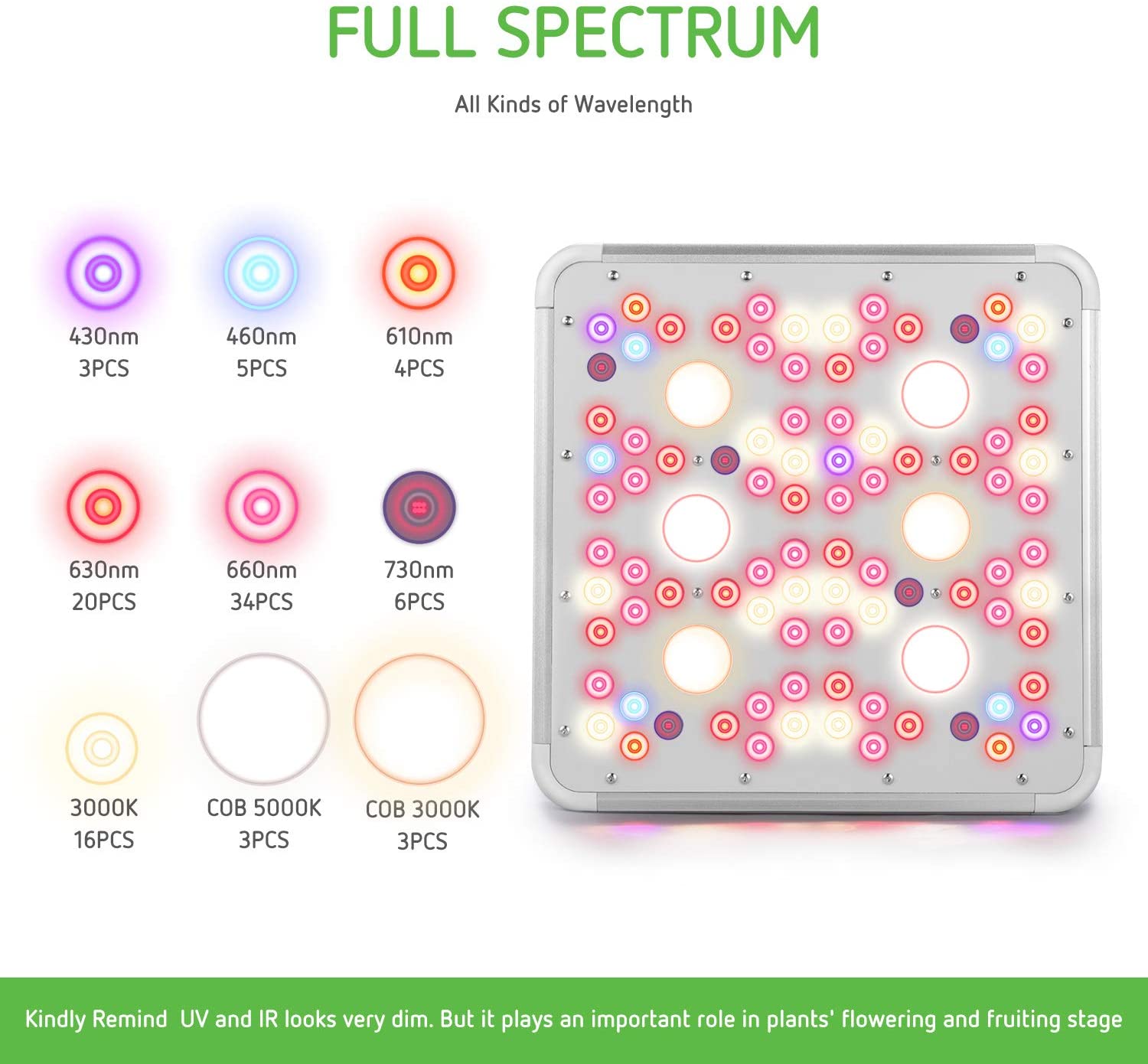 EFFECTIVELY PROMOTE GROWING: Scientific full spectrum 410-730nm values ensure ECO Farm 's 300W led grow light indeed effective; Different wavelengths imitate natural sunlight to provide plants with everything they need