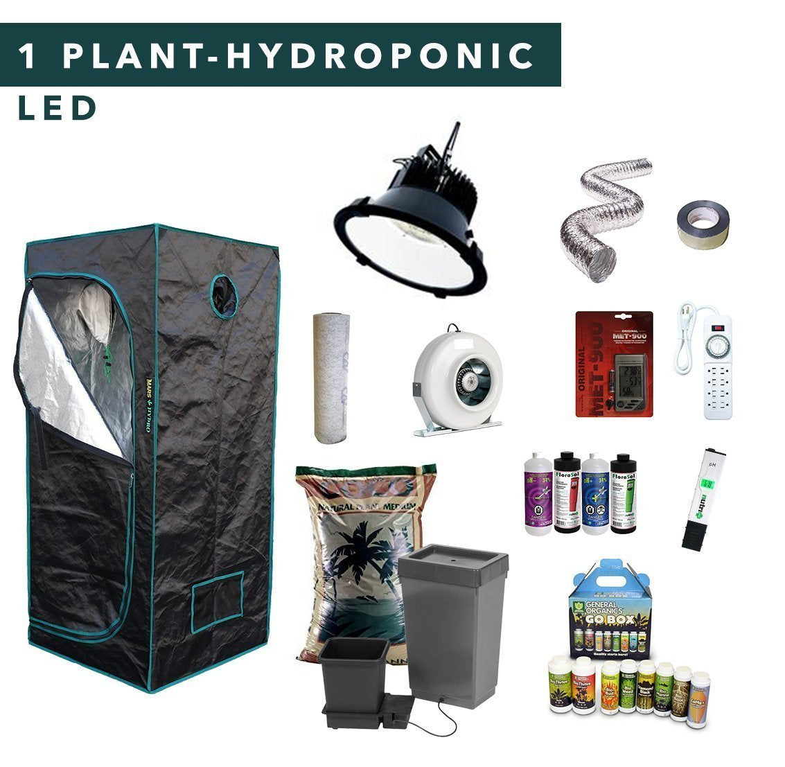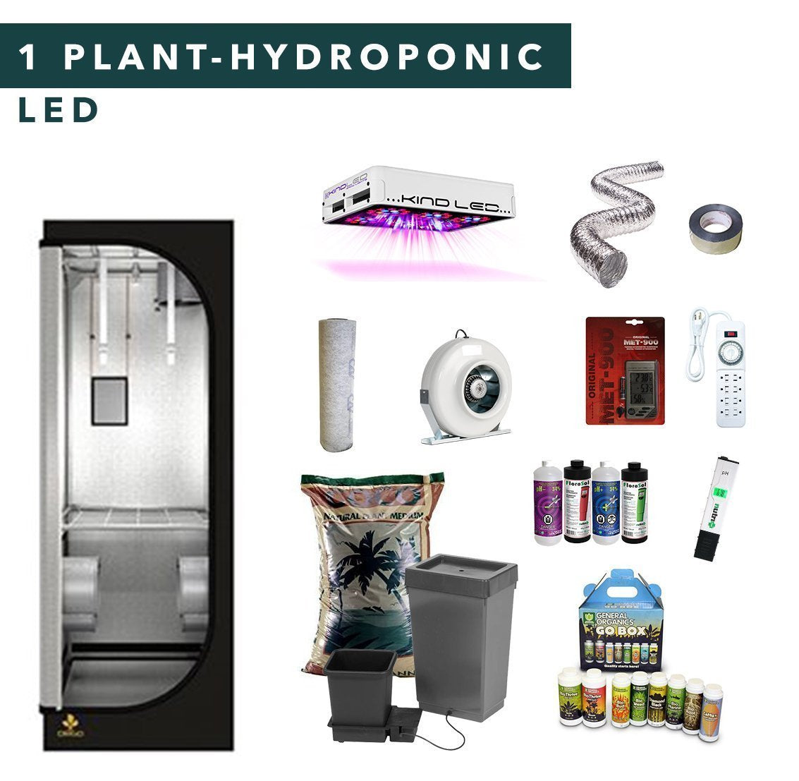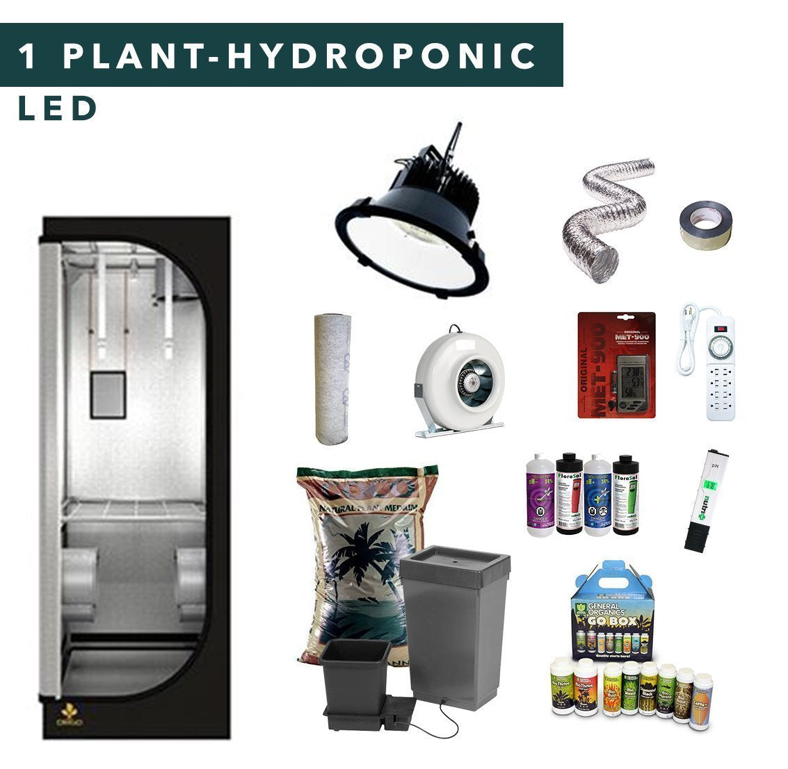 Complete 1 plant hydroponic full spectrum LED grow tent kits, it contains all the tools you needed to grow indoor plants.