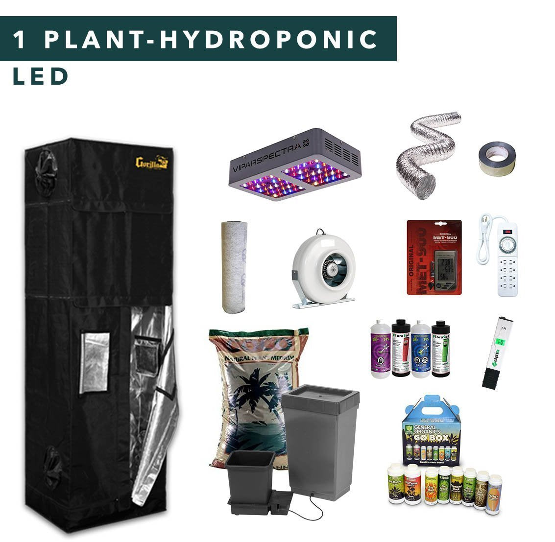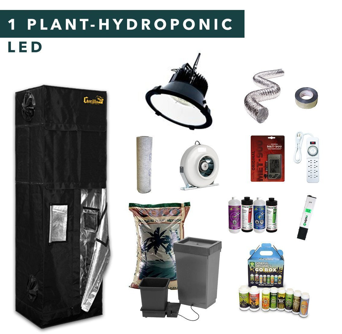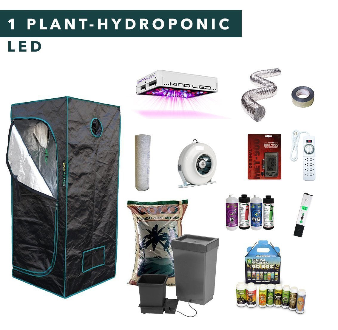 Complete 1 plant hydroponic full spectrum LED grow tent kits, it contains all the tools you needed to grow indoor plants.