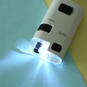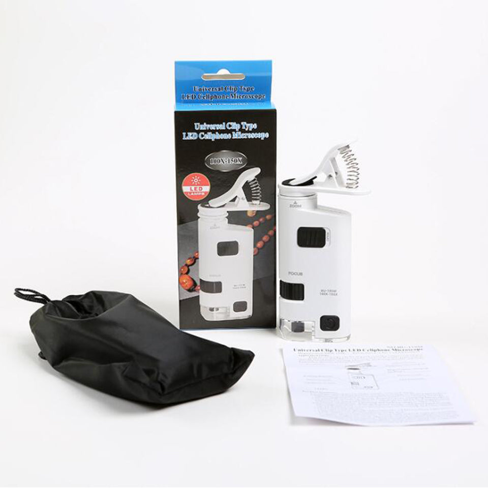 • This version of the Microscope is an easy to use LED and UV Lighted Pocket Microscope with an included Universal Smartphone Digi scoping Adapter Clip | Magnification: 100X-150X.