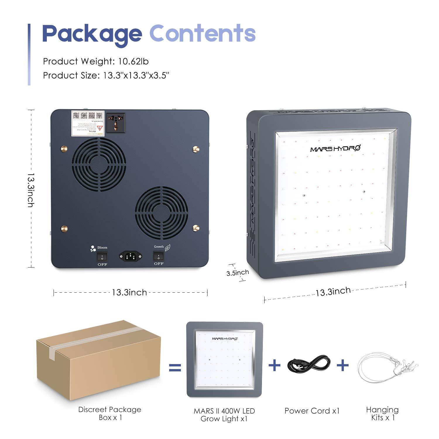 | Package Included: | 1 x MARSHYDRO Mars II 400W 1 x Power Cord ( 6.67ft /200cm ) 1 x Hanging kits 1 x instruction manual | 1 x MARSHYDRO Mars II 900W 1 x Power Cord ( 6.67ft /200cm ) 1 x Hanging kits 1 x instruction manual | 1 x MARSHYDRO Mars II 1600W 1 x Power Cord ( 6.67ft /200cm ) 1 x Hanging kits 1 x instruction manual |