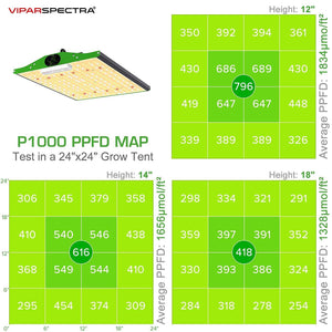 The Dimmable P1000 LED grow light is perfect for 2.5’x2.5’ vegetative coverage at 20” and 2’x2’ flowering coverage at 16”. Remember to properly adjust the height and brightness accordingly to your plant's desired level for optimal growth.
