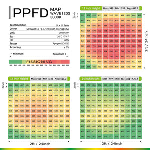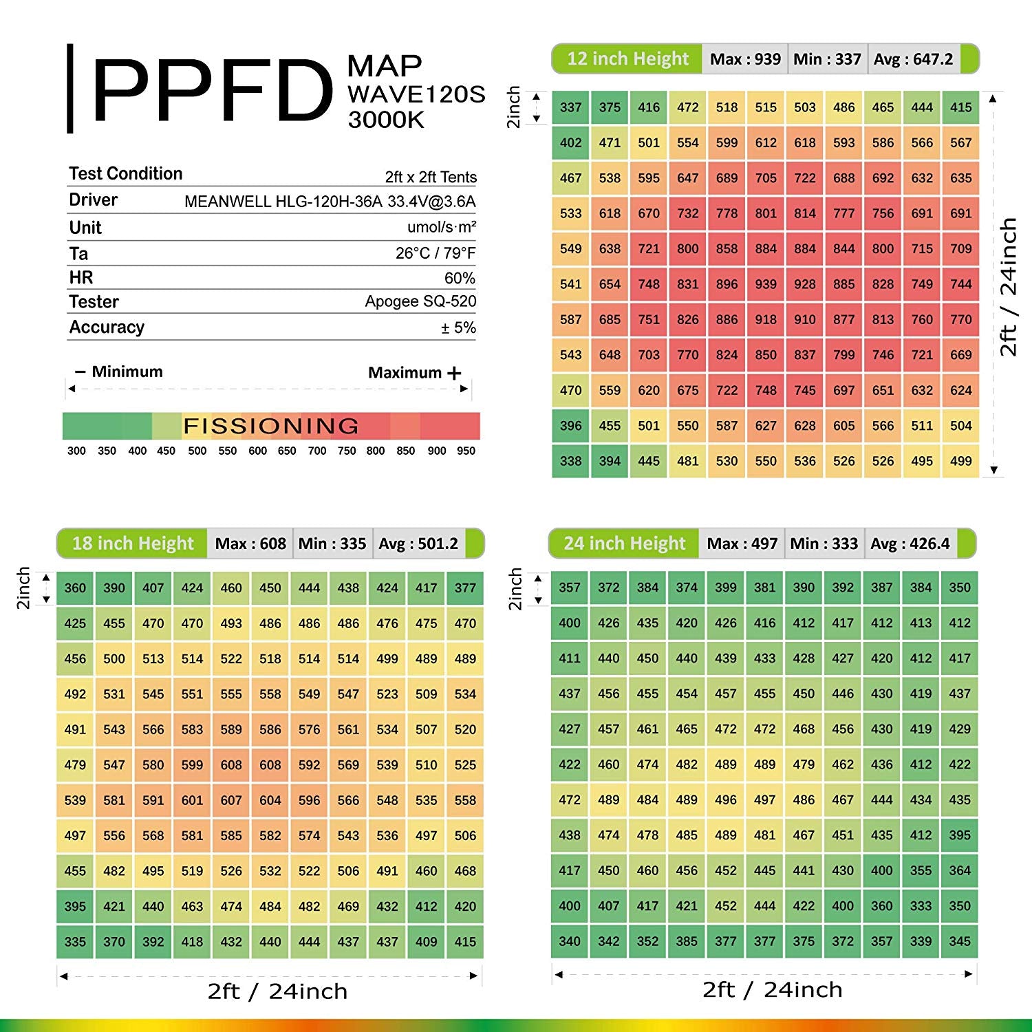 EXTREME HIGH EFFICACY : FISSIONING WAVE 120S 3000K supply 2.5 umol/W and 320umol/s PPF, 22000+ lumens and 175 lumens per watt. It is top level and save your planting cost and improve the planting efficacy (with MeanWell HLG120H-36A, 120W@3.6A)