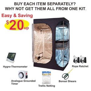 Package Include : Dark Room+2Pcs Grow Light Hangers+1-pack 5x15ft Plant Trellis Netting+1Pcs Timer+1Pcs 60mm Bonsai Shear+1Pcs Thermometer Hygrometer