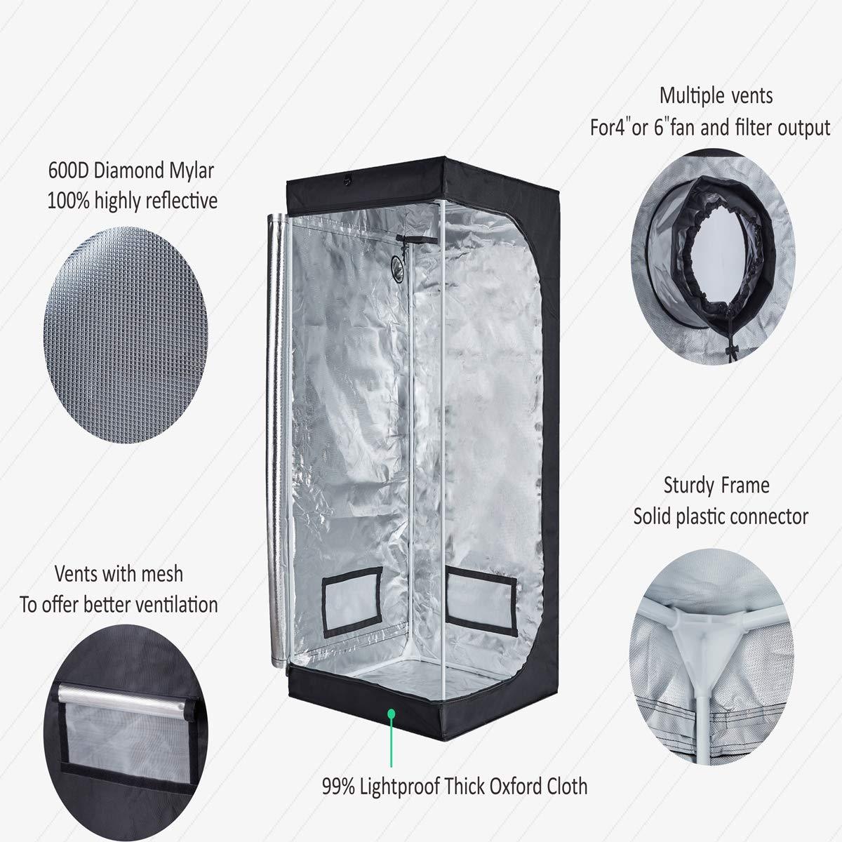 Grow tent: The superior quality 600D canvas is tear proof and double stitched for blocks all light from escaping ; the canvas is reinforced by the metal poles to ensure the security and stability. High quality zipper can protect the tent from light leaking and ensure durability and long-lasting use. We've gone to great lengths to ensure our heavy-duty metal zipper is the best on the market