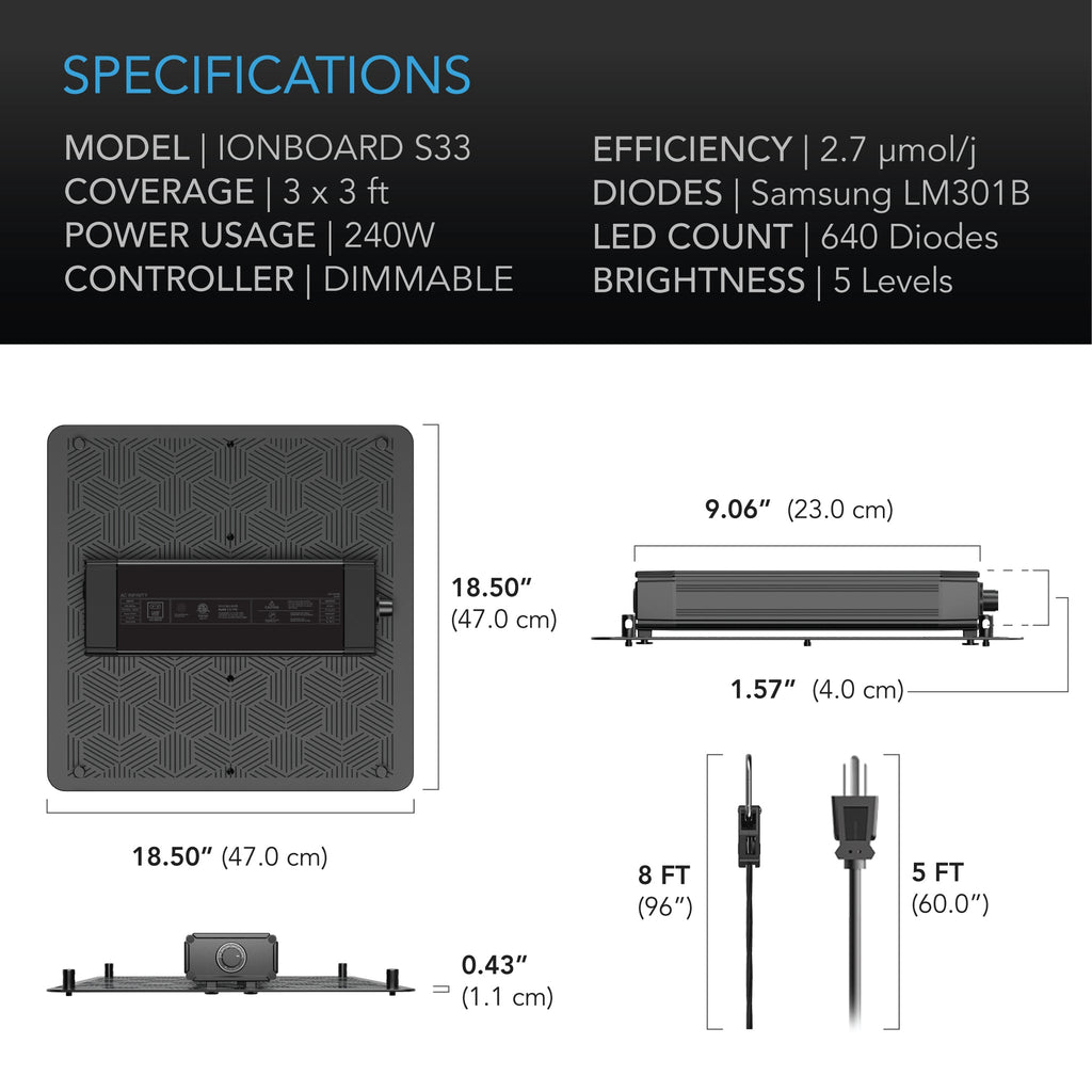 The IONBOARD S33 Full Spectrum LED Grow Light is designed with algorithmically positioned Samsung LM301B diodes to maximize plant yield. This LED grow light features, proprietary drivers, for dimming, daisy-chaining, and interfacing with our smart controllers. Built on a fanless one-piece aluminium plate for heat dissipation and longer diode life. All components are sealed to IP-65 standards for optimum performance even in high temperature and humidity growth environments.