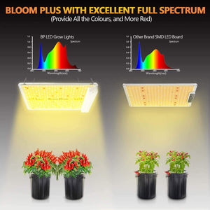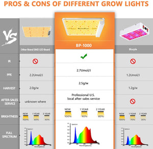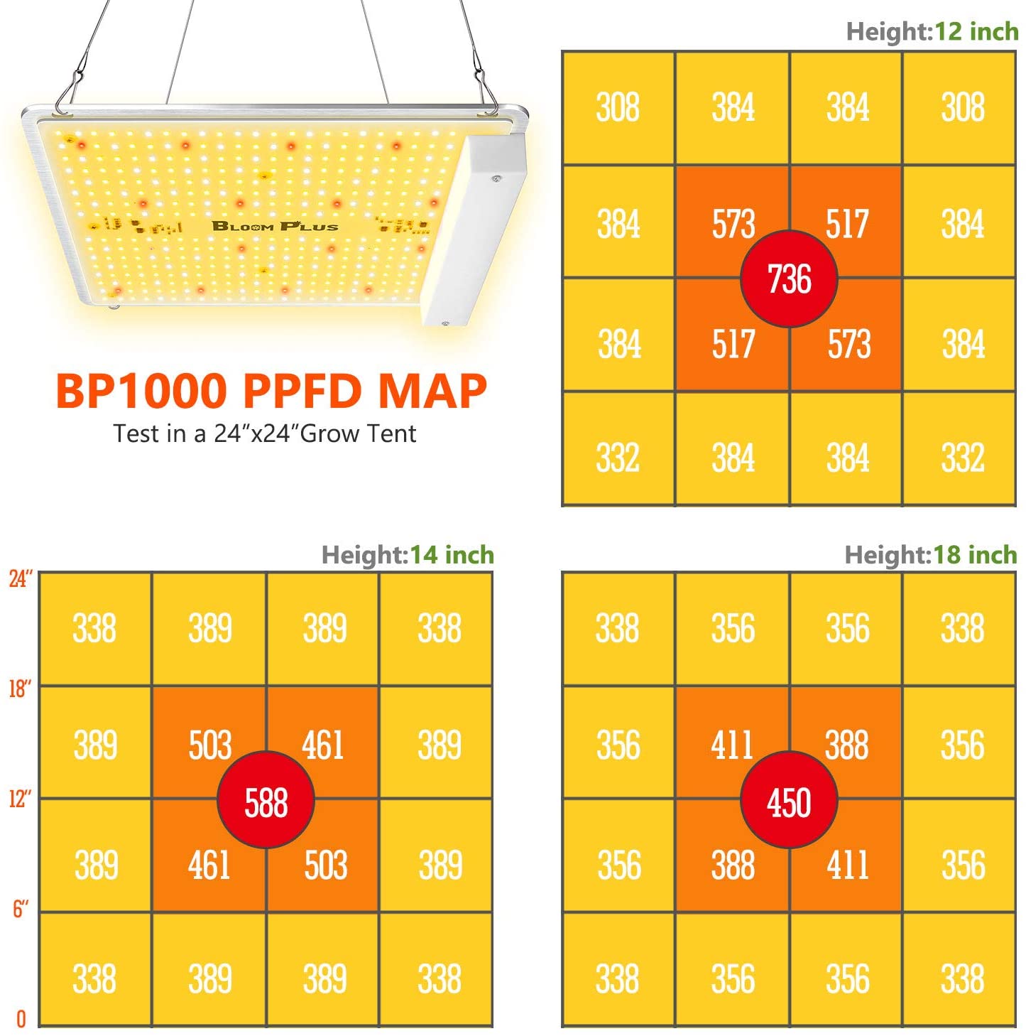 LOWER COSTS & HIGHER-QUALITY YIELDS---Using the Newest high-yield LED technology-336 pcs Samsung 2835 diodes. So BP1000 LED Grow Lights achieves a high energy efficiency of 2.7 umol/J and improves the light transmittance. The LED Growing Lights consumes only 90W of power, which is 50% less than the operating power of other 200W HID/Blurple/HPS lamps, while help gets 50% higher yield harvest. The maximum output is 2.5g/w. Veg Coverage: 2 x 2 ft, Flower: 1.5 x 1.5 ft.