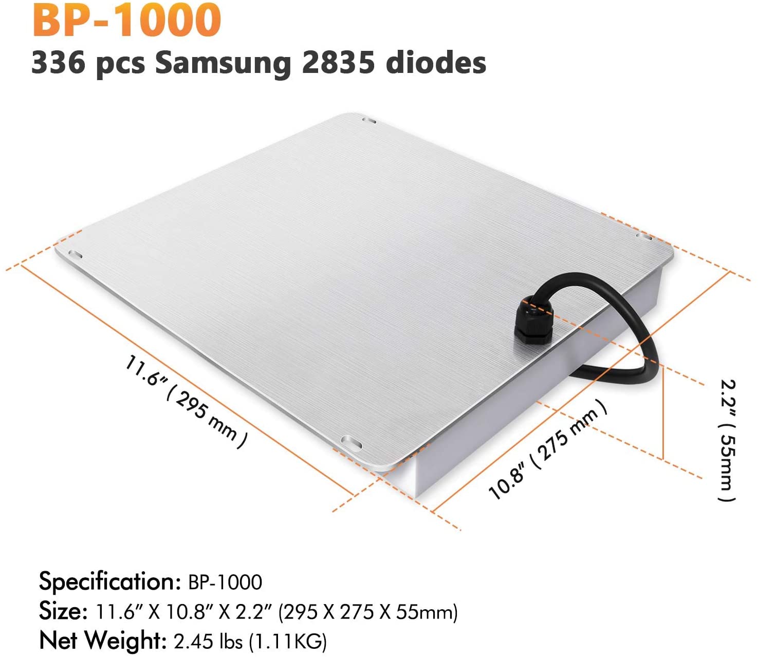 Specification Model: BP-1000 Size: 11.6” X 10.8” X 2.2” (295 X 275 X 55mm) Net Weight: 2.45 lbs (1.11KG) Gross Weight: 3.90 lbs (1.77KG) Spectrum: 660-665nm,3000K,5000K,730-740nm Power draw: 90.4W±5%@AC120V 89.71W±5%@AC240V Coverage: Veg 2 X 2 ft Flower: 1.5 X 1.5 ft DB: 0dB Input Voltage: AC110-130V Amp: 1.271A@AC120V 0.7719A@AC240V Frequency: 50-60HZ