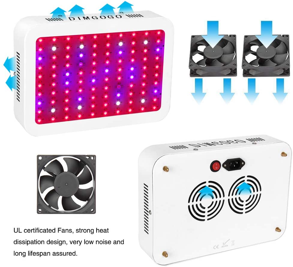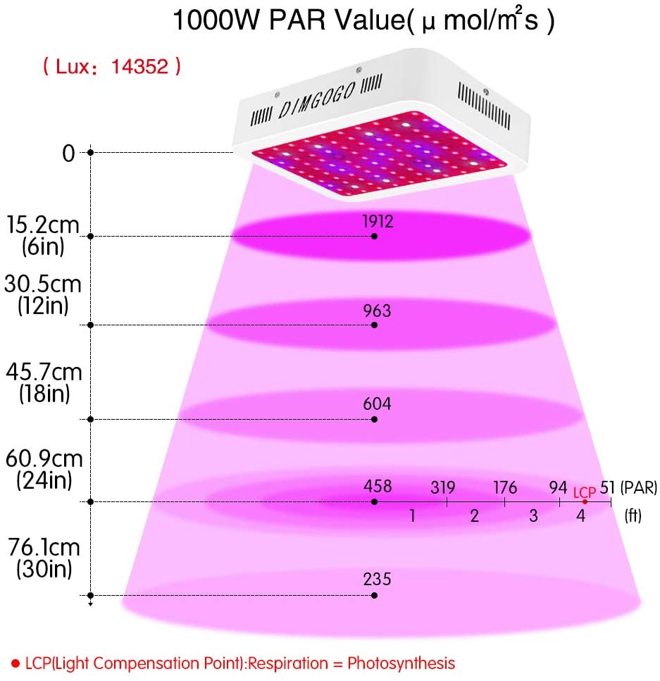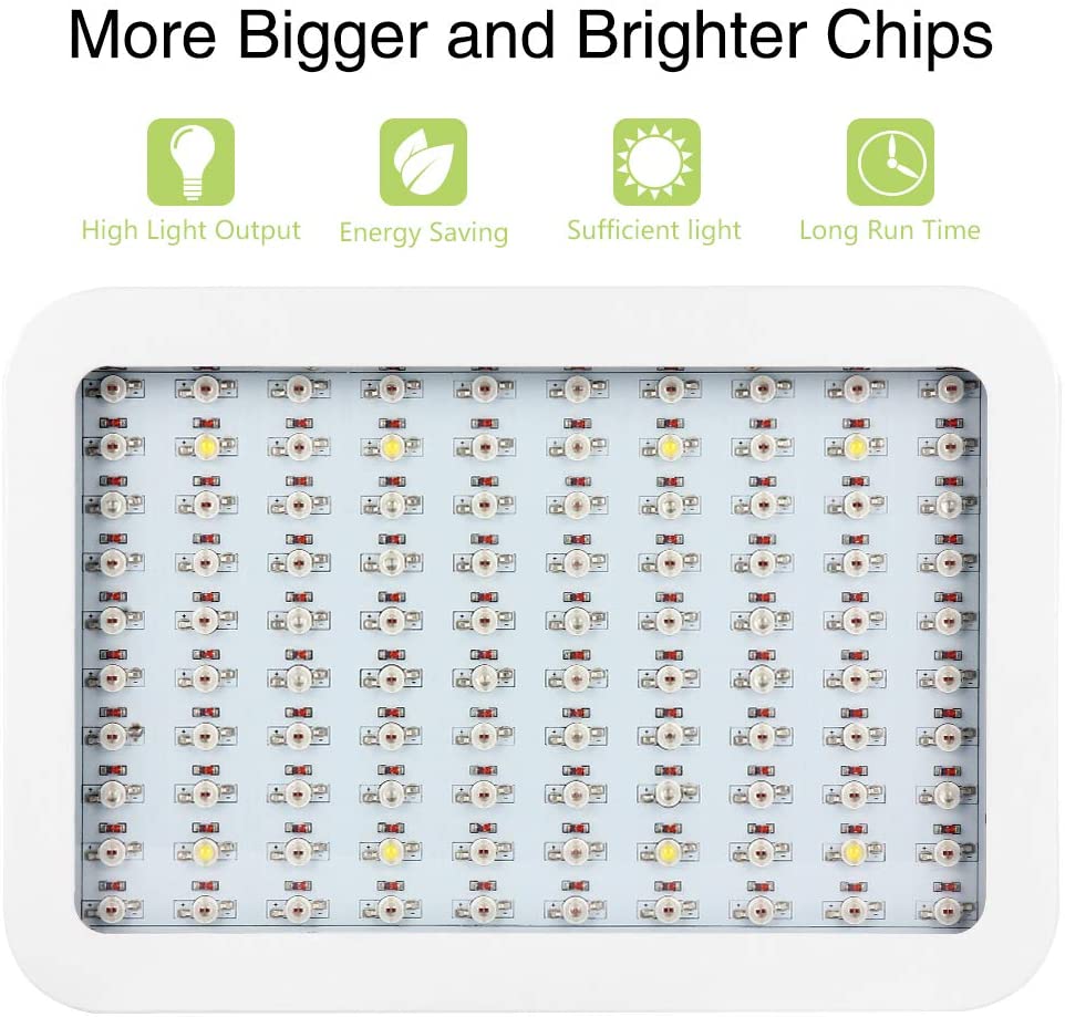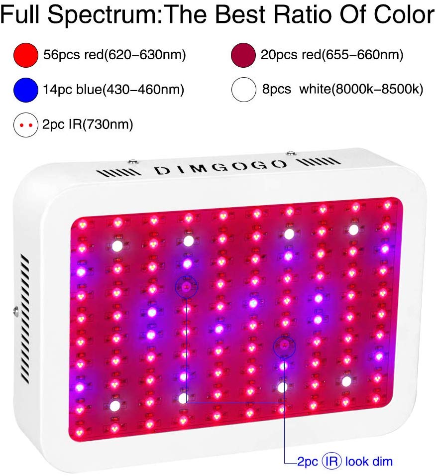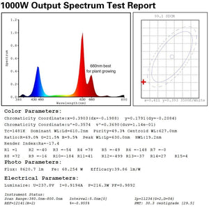 This full spectrum 1000 watt indoor plant grow lights are designed to mimic natural light with a balanced spectrum of red, blue and white, UV and IR. These colors provide different benefits in different stages to the plants allowing them to grow healthy even indoors. NOTE: the IR LED looks dim but it's helpful for flowering.