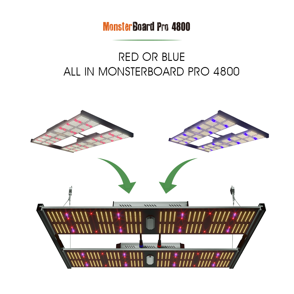 Geeklight growth lamp 480W with top bin lm301h/b UV IR smart app control RJ12 daisy chain hydroponic led grow light. Monster board pro support to exchange from Veg to Bloom pattern, gaining higher yield in different stage; Daisy Chain function can bring you big convenience to control all lights through one light or control box; Uniform par map can help plants grow more uniform.