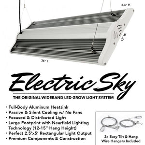 The patent-pending GS1 Wideband Spectrum replicates the Sun's infrared wavelengths for growth power, with a balanced "color ratio" to instruct plants to grow in a shape that maximizes yield. Electric Sky will put the "fun" back into your indoor garden as you watch your plants respond and develop quickly to the spectrum from seed through flower.