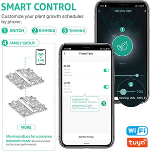 After completing the wifi setting at first time, you can control LED grow light anytime and anywhere by your phone. The APP will help you configure single light or manage groups of lights. So the LED grow lights will work automatically everyday as your planting plan. Forget about the clumsy knob. Groplanner will get you free of trouble on switch, dimming and timing. It's a start-to-finish cushy experience -- found only on Groplanner LED grow lights.