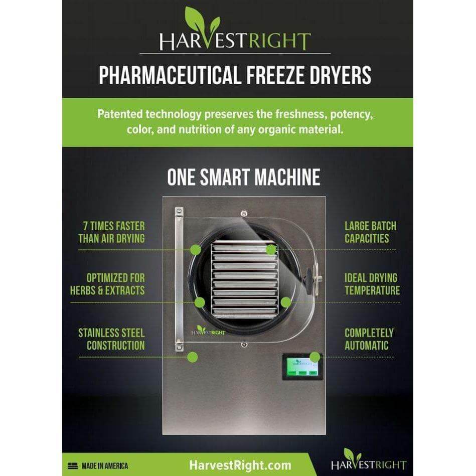 The small Harvest Right Pharmaceutical freeze dryer is perfect for smaller volume labs and home bubble hash enthusiasts. It enables hash makers to dry up to 3.75 - 5 lb of wet hash per cycle, equating to .9 - 1.25 lb of dry hash each run.