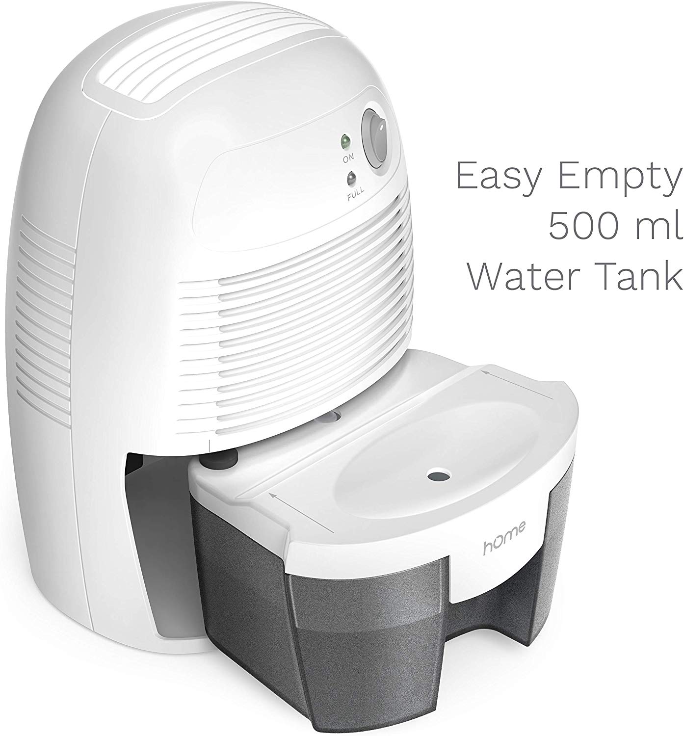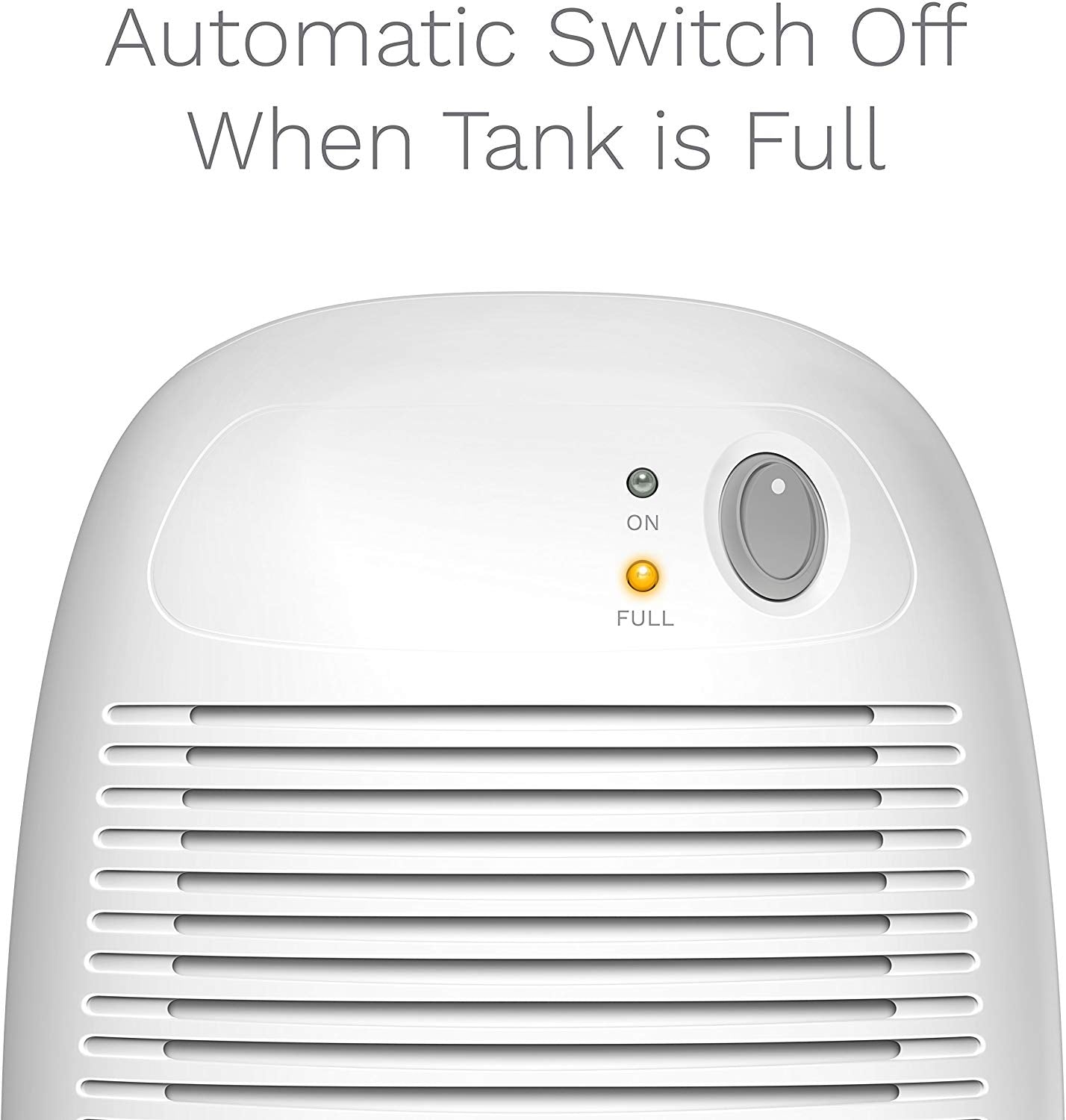 Measuring at 6.5 x 5.3 x 8.5 inches this compact mini dehumidifier is ideal for small spaces like bathrooms, kitchens, closets, storage rooms, wardrobes, RVs or offices. It sports a 16 ounce/500ml capacity tank that extracts up to 9 ounces/250 ml of moisture daily. It works efficiently, effectively, and quietly to remove moisture in rooms up to 150 square feet.
