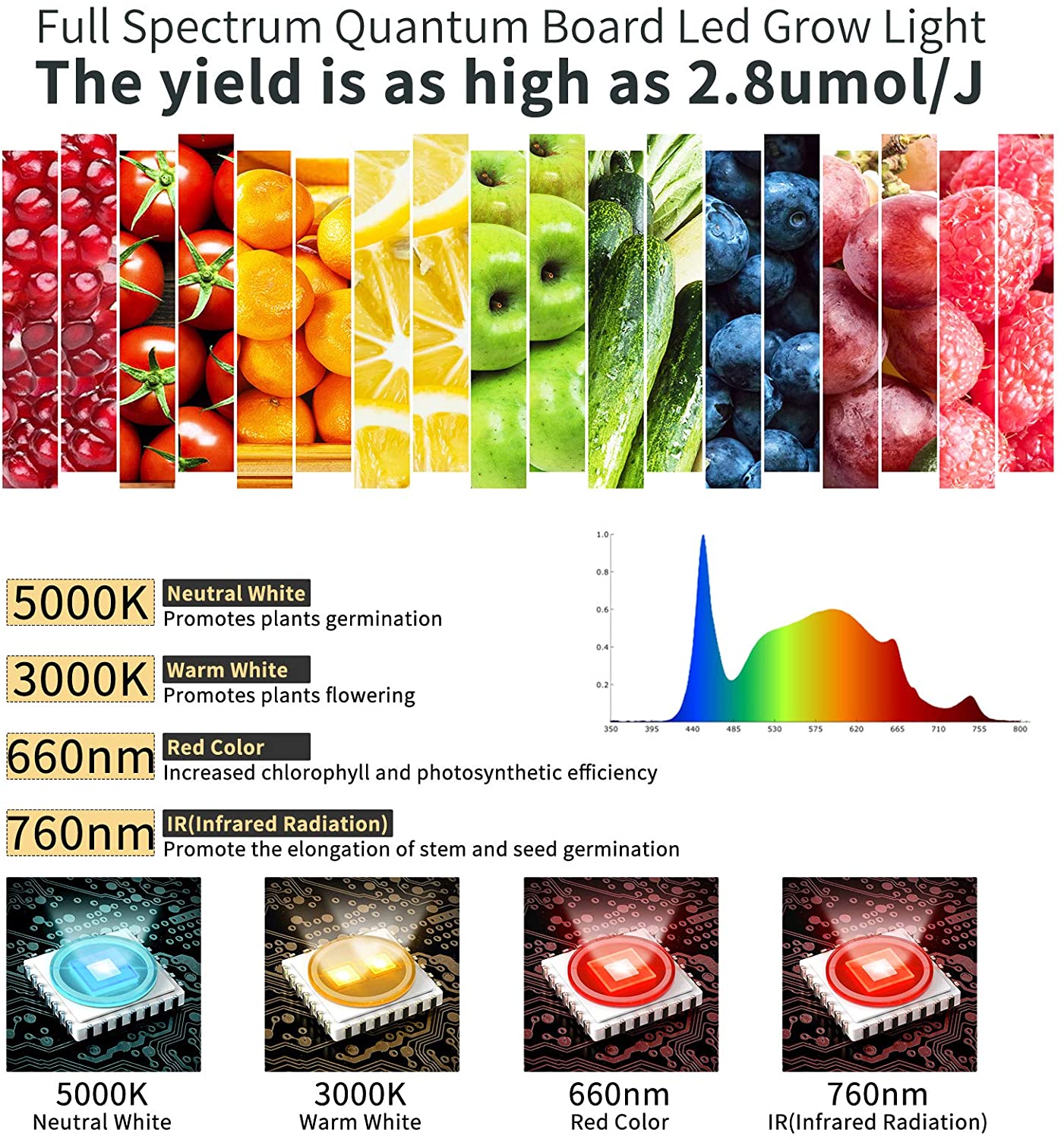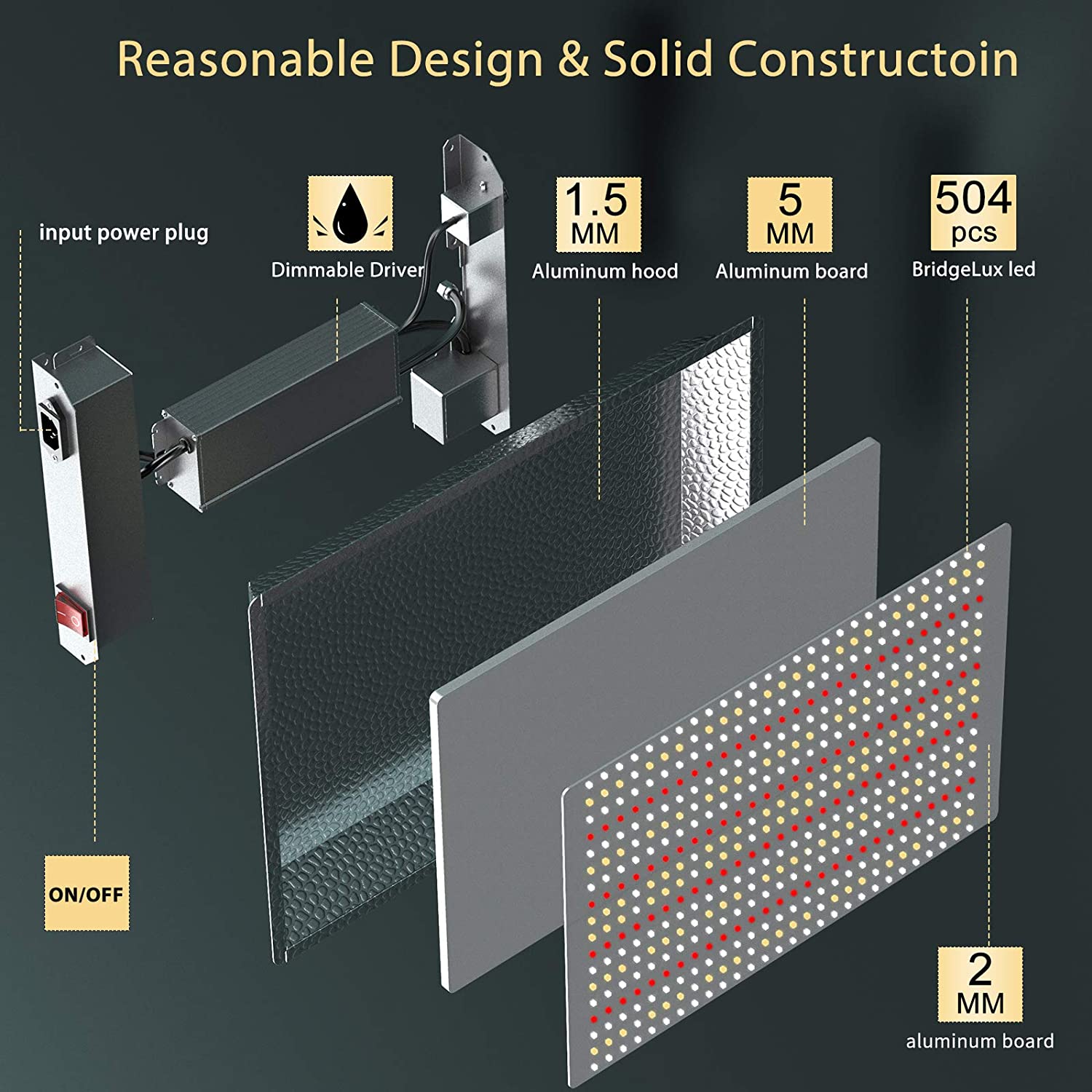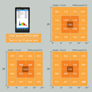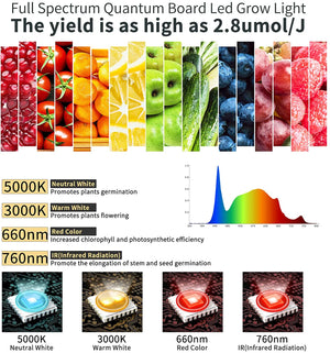 Specifications :Important parameters as follows 1. Draw power: 150W ± 5% @AC120V/240V 2. Input Voltage: 100V-277VAC/50-60Hz 3. LED Brand: 504PCS Bridgelux Leds 4. Replacement: 400w HPS/MH 5. Veg Footprint: 4 x 3 ft (Max coverage) 6. Flower Footprint: 3 x 2 ft (Core coverage) 7. Spectrum: 3000K,6000K,660-665nm,IR 760nm 8. Max ambient operating temperature: 40°C(104°F) |