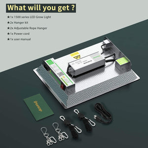 Packing List :What You will get 1 x Dimmable LED Grow Ligh 1 x LED Grow Light 2 x Hanger kit 2 x Adjustable Rope Hanger 1 x user manual 1 x Power Cord (Double Use for Daisy Chain) |
