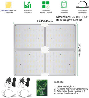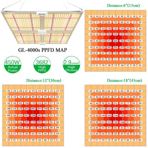 ENHANCED FULL SPECTRUM: GL4000s uses the most efficient Samsung LM301b 3000K and 5000K diodes, significantly increasing Red 660nm (200pcs) and IR 740nm (80pcs) LEDs, with UVA395-405nm (16pcs) LEDs. This optimal, Full Spectrum growing light is ideal for all plant growth statuses, from Seeding, Veg, Bloom to Fruit. Significantly improves PAR and the efficiency up to 2.9umol/J; can increase yields up to 50% more than other grow lamps. Veg coverage is 6x6 ft; Flowering coverage is 5x5 ft.
