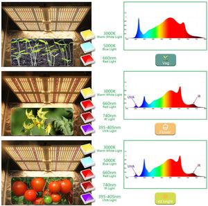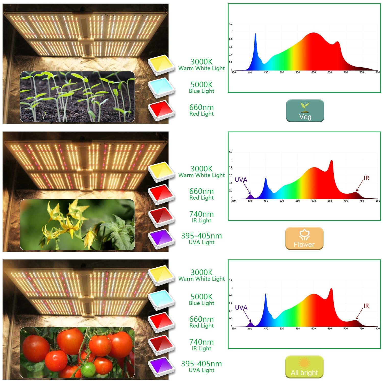 MULTI-FUNCTION&MODES: Multi choice for different growth stages, ‘VEG’ mode, 5000K Bluish lights increase, suitable for seeding/germination and young vegetative growth. ‘Flower’ Mode, Blue lights reduced, 660nm Red lights and IR/UVA turned on, which enhance the light intensity, suit for Flowering and Fruiting. Use ‘All Bright’ Mode to get more Lumen output for fast plant growing. The brightness of all Modes can be dimmed 15%-100% and Timing setting to match your plants’ various growth stages.