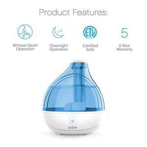 Product Specifications: Size: 8” x 6” x 9” | Power: 120V, 50Hz | Max Run Time: 16 hrs | Coverage Area: 250 sq ft | Tank Capacity: 1.5 Liters (.4 Gallons)
