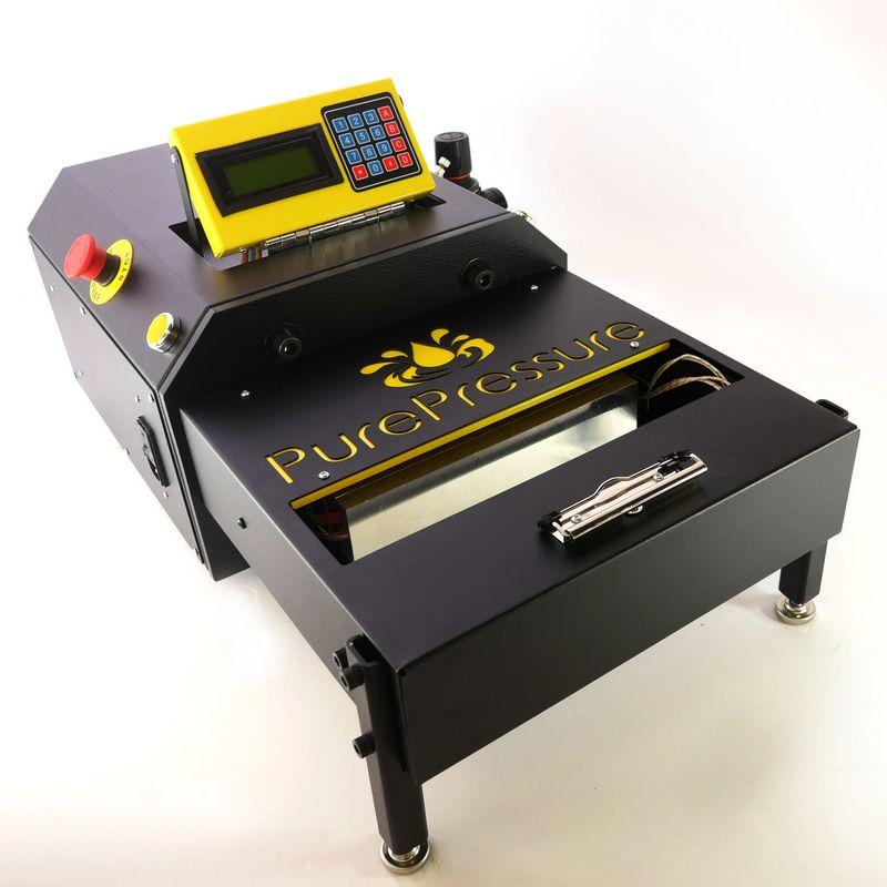That force and the 10 x 3 inch plates can process over 3.75 lb of flower per day (or 7 lb+ of dry sift or hash).