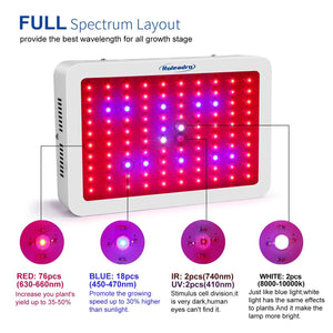 • Blurples Light: An infrared grow light that is great for indoor plants. All Kinds of Indoor Plants Will be Happy in all Growth Stage at Any Time and Anywhere! The secret is our grow light extracted the most useful Blue Red IR UV and white light spectrum from natural sunlight to help plants perform photosynthesis better. Different from other full spectrum grow lights, we added more RED light to ensure the yield will be increased up to 30%-50%.