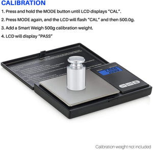WARRANTY/INCLUDES–The Smart Weigh Pocket Scale is backed with a 2 year warranty- you can be confident in your buying decision. Our friendly Customer Service Team is always available to answer any question or concern. The scale is powered by 2 x AAA batteries (included). Use the protective scale cover as a weighing tray and to expand the scale’s platform. The Mode button can be used for scale recalibration.