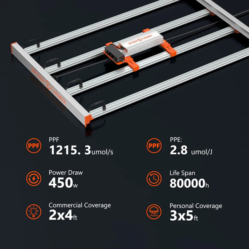 Spider Farmer G4500 led grow light adopts a unique light bar design to provide more even and comprehensive canopy coverage, especially at the edge of the planting area.