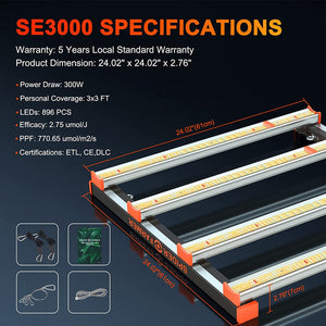 MAXIMUM UNIFORMITY & EFFICIENCY: Unique designed 4 extended LED bars to edges which can provide more even canopy coverage, especially to the outer edges of cultivation areas. With 896pcs SAMSUNG LM301B diodes, SE3000 Led grow lights draw 300 watts with 822.82umol/s, achieving an impressive PPE of 2.75 umol/J, coverage for 2'x2' to 3'x3′ of high-yielding full-cycle growth.