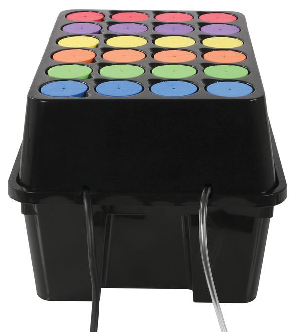 Super Sprouter® Root Rain® 24 Site Spray Clone Machine is a complete system to start 24 individual plant cuttings or clones. The spray generated from the aeroponic cloner offers suspended cuttings and a rich combination of oxygen and water for accelerated and healthy root growth. Super Sprouter® Root Rain® Cloner is easy to assemble and simple to use. Comes with tub, lid, 30 multicolored neoprene inserts, internal sprayer and pump, air pump, 4 in air stone, tubing, and instructions.
