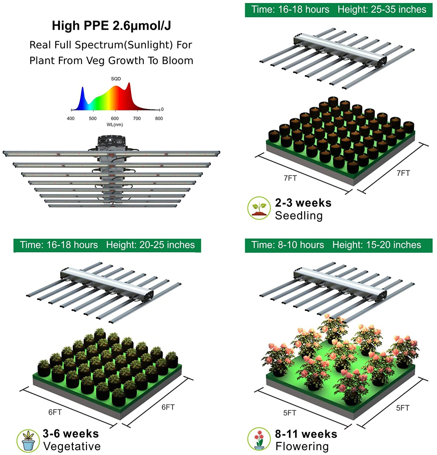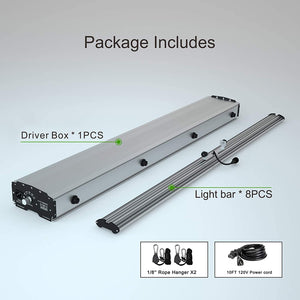 UNIFORM DETACHABLE PRECISE AlphaPar LIGHTING: Built with 8 removable bars with a driver box, which makes the light is easy stored and shipped. And which would also enable the exact dynamic PPFD control over each of plant growing stages, detachable bars deliver highly uniform adjustable PPFD levels throughout plant canopy, its growers' best choice LED grow light.