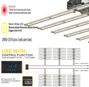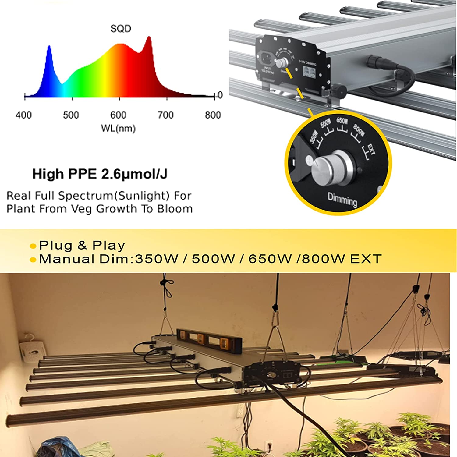 EASY DIMMING DAISY CHAIN: User-friendly dimmer suits full-cycle home horticulture. Easy manual dimming could be adjusted range is 350W/500W/650W/800W/EXT, and the light could be daisy chain max up to 15 lights and could use master light to control. Wider 8-bar light for even & broad canopy coverage. IP65 waterproof a,make it a High-End&High-Performance commercial grow light.