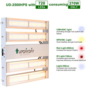 New LED HPS FULL SPECTRUM: HPS lamp always harvest double big and heavy buds in planting,Its spectral is concentrated in yellow light 580NM, orange light 610NM red light 630NM, UPDAYDAY UD2500/4000 HPS lamp, increasing 390NM, 660NM, IR740NM. VEG model add blue light helps plants grow rhizomes and lush leaves during seedling ,BLOOM model add IR stimulate the growth and flowering of stems,forming a multi-band full spectrum and increasing yield