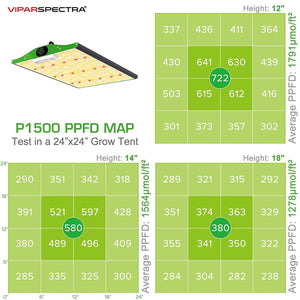 The Dimmable P1500 LED grow light is perfect for 3’x3’ vegetative coverage at 20” and 2.5’x2.5’ flowering coverage at 16”. Remember to properly adjust the height and brightness accordingly to your plant's desired level for optimal growth.