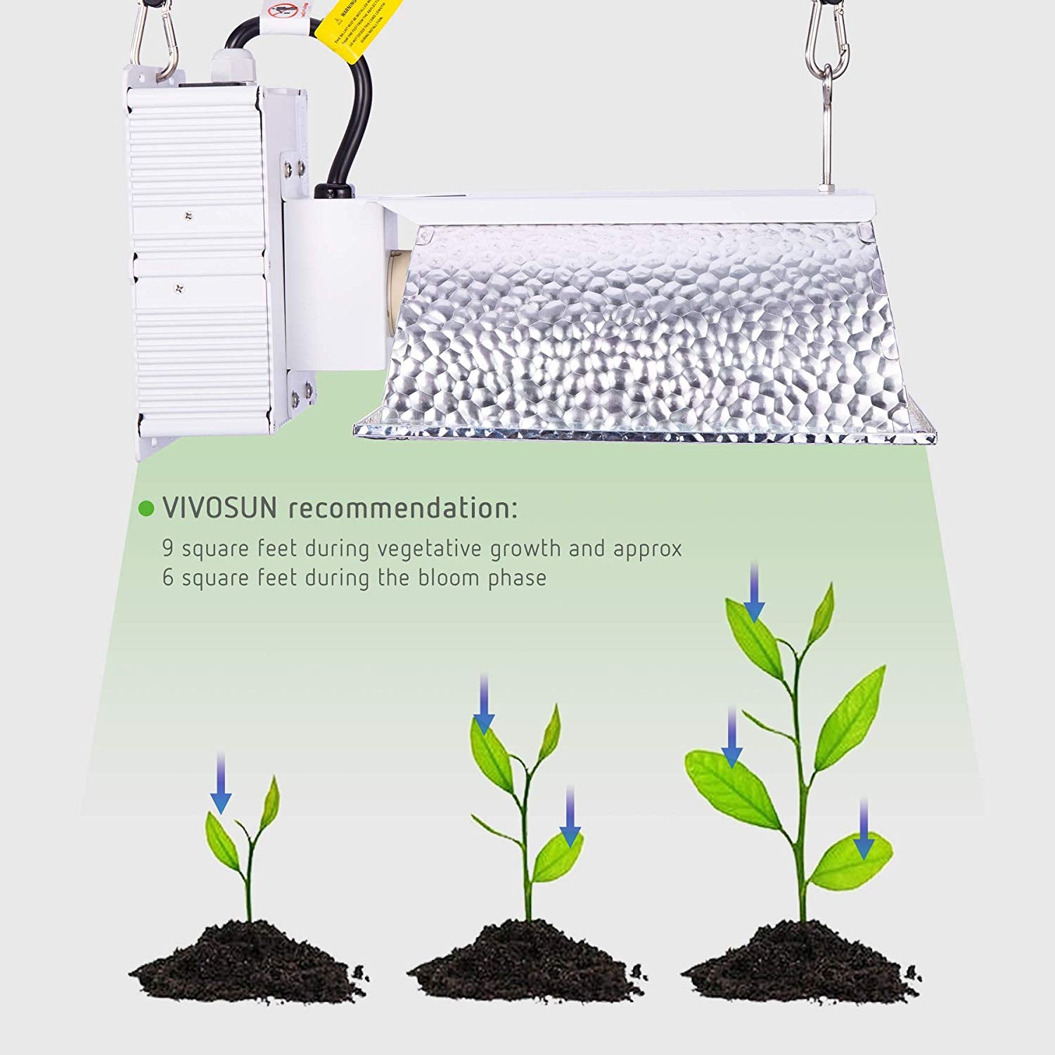 VIVOSUN recommends use of this unit to cover an area of approximately 3*3 feet during vegetative growth and approx. 6 square feet during the bloom phase.