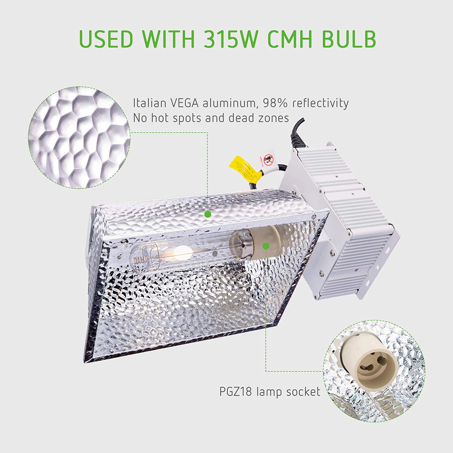 The cutting-edge hood made of imported Italian VEGA aluminum boosts reflectivity by 20% compared to standard aluminum reflectors; Unit has an excellent light reflectivity rating of 98% ; Contouring of the polished reflective surface ensures no hot spots or dead spots.